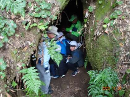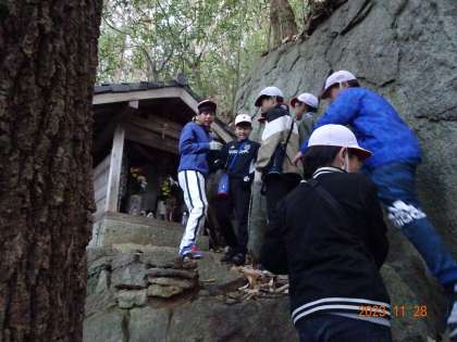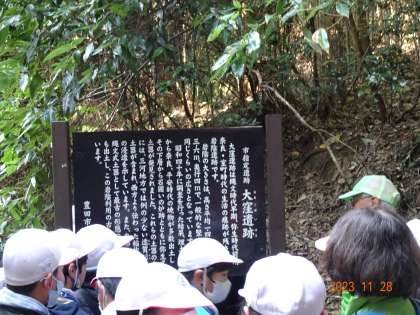 里山学習 大昔の遺跡にどきどき 公開日 2023/11/29 更新日 2023/11/29 各学年から 里山の奥にひっそりと大窪遺跡があります。大昔の人たちが農業のために住んでいた跡だそうです。どきどきしながら洞穴の中に入り、古代の人々に思いを馳せました。