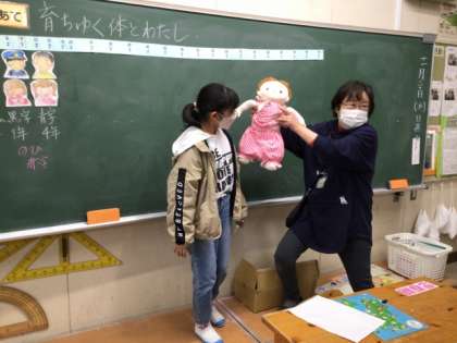 養護教諭による命の授業を行いました。産まれたときの身長・体重を保護者の方に聞き、どのくらい身長が伸びたかカードに書いたり、赤ちゃんの頃着ていた服や靴を見たりして、「こんなに伸びたんだ!」「こんなに小さかったの!?」と驚きの声が聞こえてきました。そして、ここまで育ててくれたお家の人への感謝の気持ちをカードに書きました。また、思春期に入ると体や心がどのように変わっていくのかゲームをしながら学びました。