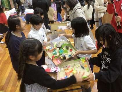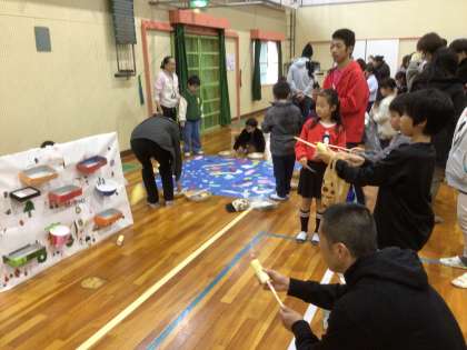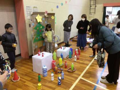 【2年生 学習発表会】12/12 公開日 2023/12/13 更新日 2023/12/13 学校行事 2年生は、生活科「おもちゃまつりへようこそ」の学習のまとめとして、発表を行いました。グループで協力し合って、色々なおもちゃやさんになりました。お客さんである友達や保護者の方たちを楽しませることができました。丁寧におもちゃの持ち方を教えたり、優しく声をかけてアドバイスをしたり、はりきってお客さんをもてなしていました。友達や保護者の方たちに喜んでいただくことができました。