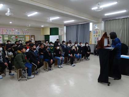 【6年生 平和学習】1/18 公開日 2024/01/29 更新日 2024/01/29 各学年から 6年生は、壁画家として活躍されている方を講師に招いて平和学習を行いました。お母様の戦時中の手記を読んでいただいたり、平和に関する紙芝居をしていただいたりして、戦争、平和について考えました。