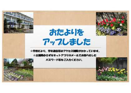 「いきいき古瀬間っ子」「1〜6年学年通信」をアップしました。 公開日 2024/04/04 更新日 2024/04/04 お知らせ こちらをクリックしてご覧ください。 ↓ いきいき古瀬間っ子 4月4日号 1年学年通信 4月4日号 2年学年通信 4月4日号 3年学年通信 4月4日号 4年学年通信 4月4日号 5年学年通信 4月4日号 6年学年通信 4月4日号 アクセス制限がかかっています。本日お子さんに配布したお便りに記載されているユーザー名、パスワードを入れてください。