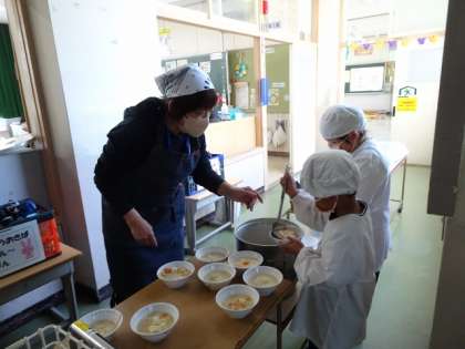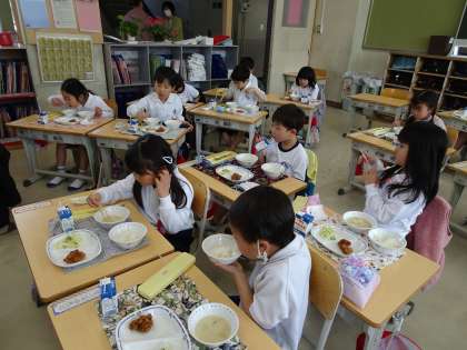 1年生、初めての給食でした。給食当番も自分たちで行いました。