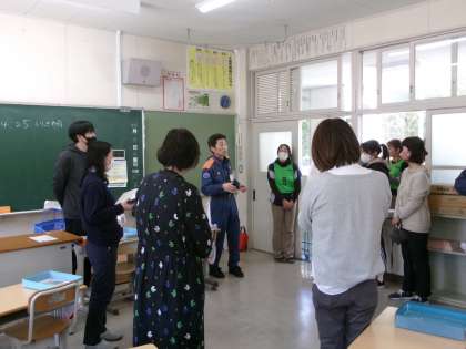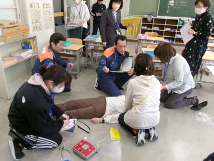 【教職員 シミュレーション研修】4/9 公開日 2024/04/17 更新日 2024/04/17 お知らせ 4月9日、松平消防署の方を招いて教職員のシミュレーション研修を行いました。万が一事故が起こった時、傷病者を救急隊員に引き渡すまでの役割分担を確認しました。