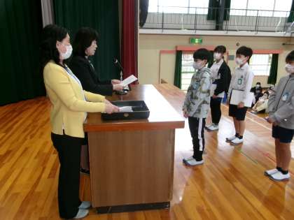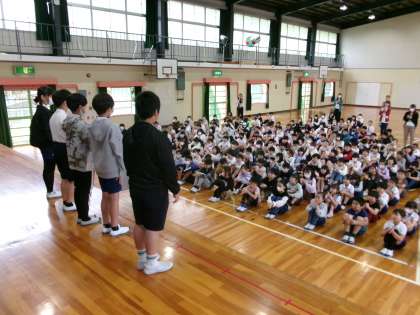 【第1回 全校集会】4/22 公開日 2024/04/25 更新日 2024/04/25 学校行事 5年ぶりの全校集会を体育館で行いました。本年度は、月に一度全校で集まって集会を行います。この日は、委員会の委員長、各学級の学級委員の認証式を行いました。一人一人が役割に責任をもち、協力してより良い活動、より良い学級にしていってほしいと思います。