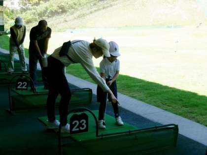 志賀ゴルフ・メグリアコースです。ゴルフ場では体験もさせていただき、子どもたちは、ボールやクラブの重さに驚いていました。メグリアではメモがびっしりと埋まるくらい質問に答えていただき、たくさんのことを知ることができました。