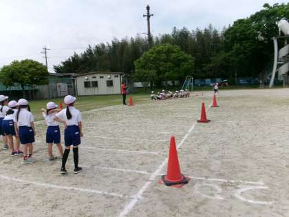 1・2・3年生が体力テストを行いました。立ち幅跳び、ソフトボール投げ、50メートル走です。どの子も、一生懸命、記録に挑戦していました。3年生は、先日の走り方教室で学んだことを生かして50メートルを走りました。