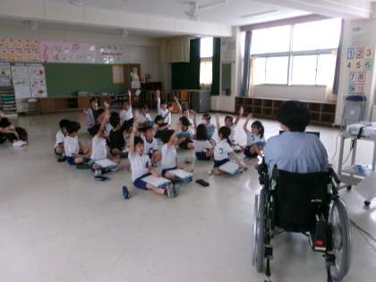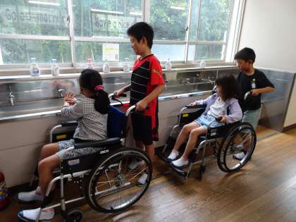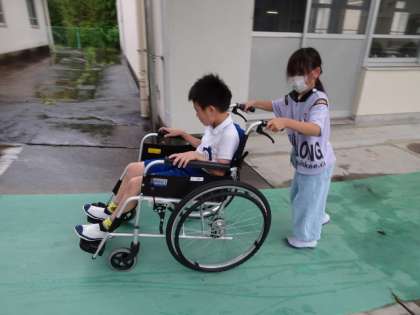 【3年生 車いす体験】6/18 公開日 2024/06/25 更新日 2024/06/25 各学年から 3年生は、総合的な学習で福祉実践教室の車いす体験を行いました。体験では、車いすを押したり、実際に乗ったりしました。坂を上るときは、力を入れながら前を見て操作することに難しさを感じている様子でした。水道は、車体を横向きにしないと使えないことに驚いていました。講話を聞いて、バリアをなくすために自分ができることについて考えることができました。