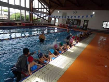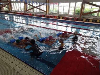 1・2年生と7・8・9組が豊田スイミングスクール美里校で水泳学習が始まりました。元気よくバタ足をしたり、友達とペアになって大きなビート板を使って泳いだりととても楽しそうに活動しました。