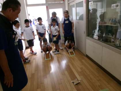 3年生は、理科「ゴムと風の力のはたらき」の学習で、ものづくりサポーターさんをお招きして風で動く車を作りました。車を作っては実験を行い、より遠くに進むために試行錯誤しました。最後に体育館でどれだけ進むか実験しました。遠くに進むためには、帆を大きくして風を受ける面積を広くしたり、材料をできるだけ軽くしたりすることが大切だと分かりました。楽しい授業をしてくださったものづくりサポーターの皆様、また、車作りに必要な材料のご準備をしてくださった保護者の皆様、ありがとうございました。