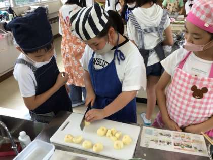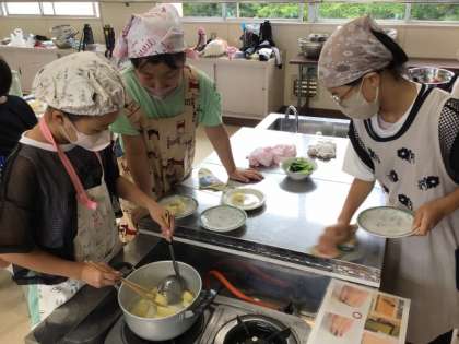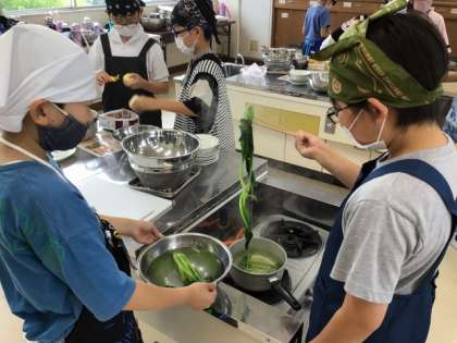 7月9日、10日、家庭科の「ゆでる調理でおいしさ発見!」の授業で、小松菜のおひたしとゆでいもを作りました。初めての調理実習でしたが、グループのメンバーで協力して時間内に2品作ることができました。とても美味しくできて満足そうにしていました。家でも作って家族に食べてもらった子もたくさんいました。