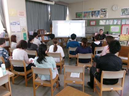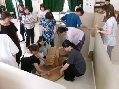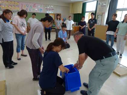 避難所設営についての研修の様子です。豊田市役所防災課の方を講師に招き、災害が起こった際の行動や避難所での間仕切りやトイレの設営の仕方について学びました。夏休み中には、南海トラフ臨時情報が発表されました。解除はされましたが、子どもたちの安全を守るために防災への意識を一層高めていきたいと思います。