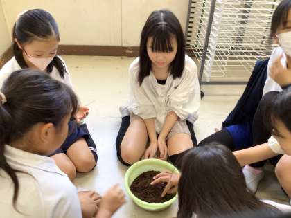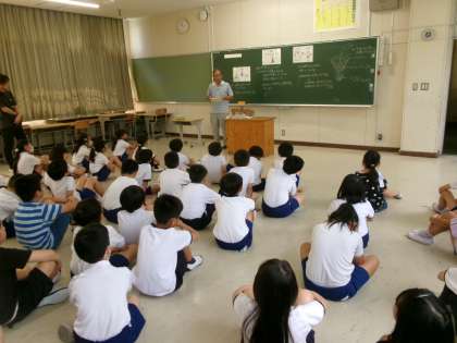 【4年生 4tuneプロジェクト】9/4 公開日 2024/09/05 更新日 2024/09/05 各学年から 4年生は、総合的な学習で環境問題について学習しています。この日は、普段からお世話になっている古瀬間小学校の公務手さんから、畑に使う肥料についての話を聞きました。有機肥料の良さや化学肥料との違いについて学びました。