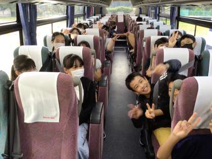 6年生を乗せたバスは、京都へ向けて高速道路を走っています。バスの中は、とても盛り上がっています。