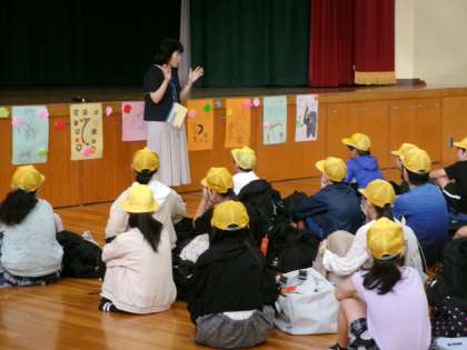 6年生が修学旅行へ行きました。出発前の体育館での出発式の様子です。