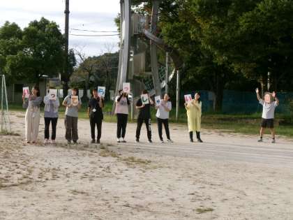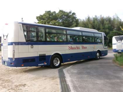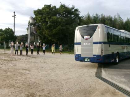 バスに乗り込み、学校を出ました。みんな元気です。 正門前で、先生たちが見送っています。