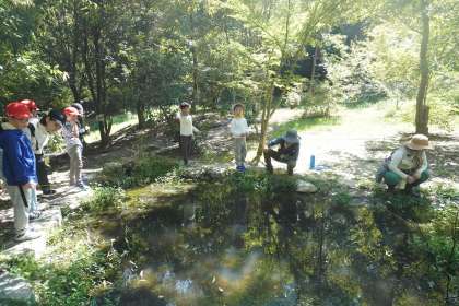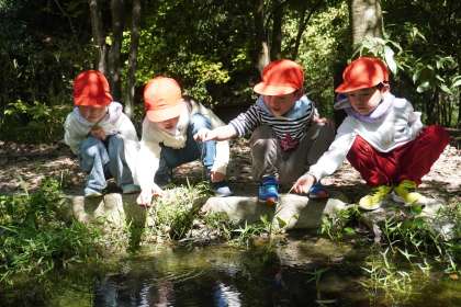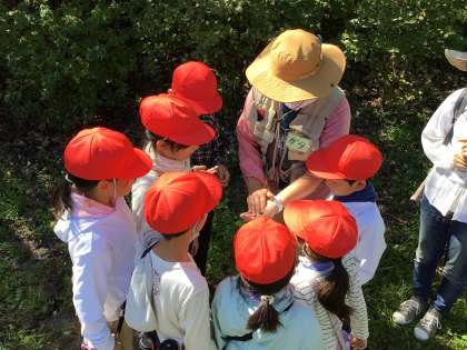 2クラスとも、クラスの中を2つのグループに分け、森の中を散策して植物や生き物の観察をしました。自然に触れ、植物や生き物の大切さについて学びました。