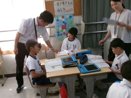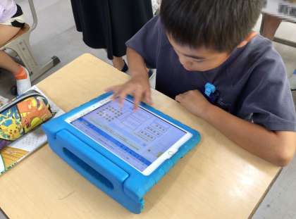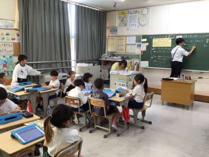 【3年2組 算数研究授業】9/25 公開日 2024/10/04 更新日 2024/10/04 各学年から 9月25日に3年2組で算数の研究授業を行いました。あまりのある割り算の学習でした。問題文を読んで、あまりの意味を考えました。考えるときに、タブレットの発表ノートを使って図を描いたり、九九を使って考えたりしました。グループワークをして友達の考えを共有しました。