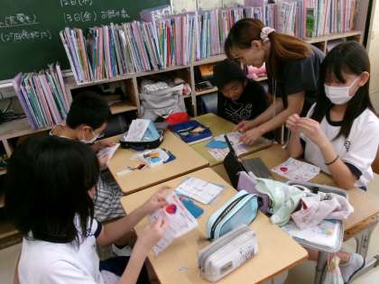 【5年生 家庭科 手縫いボランティア】9/25 公開日 2024/10/04 更新日 2024/10/04 各学年から 5年生は、家庭科の時間に裁縫道具を使いました。初めて針と糸の使い方を学習しました。玉止めや、玉結びの仕方を習い、何度も練習しました。ボランティアの方に丁寧に教えていただきました。子どもたちは「玉結びが上手にできるようになった」「玉止めのこつがわかった」と喜んでいました。