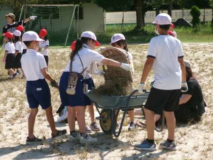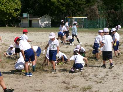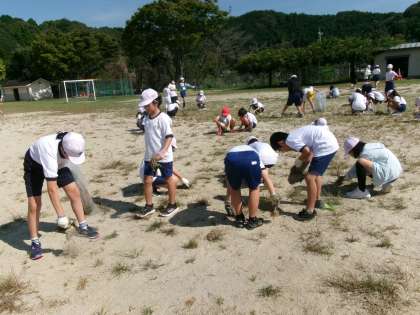 運動場の草取りを全校で行いました。環境委員会の児童が、一輪車を引き、抜いた草を集めてくれました。