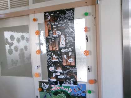 【図書ボランティア】10/11 公開日 2024/10/21 更新日 2024/10/21 地域学校共働本部 毎月第2金曜日に図書ボランティアの方たちが活動しています。 10月はハロウィンの掲示物を作ってくださいました。