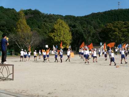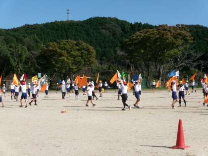 5・6年生は2学年合同で、カラフルなフラッグを使った表現を練習中です。