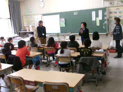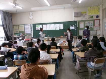【4年生 俳句を学ぶ】11/8 公開日 2024/11/18 更新日 2024/11/18 各学年から 4年生は、豊田市文化振興財団からの講師を招いて俳句について学びました。秋に関する俳句を作るために季語を考えました。柿、さつまいも、コスモスなど本物に触れながら五感を働かせて、五七五の句を考えました。
