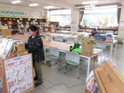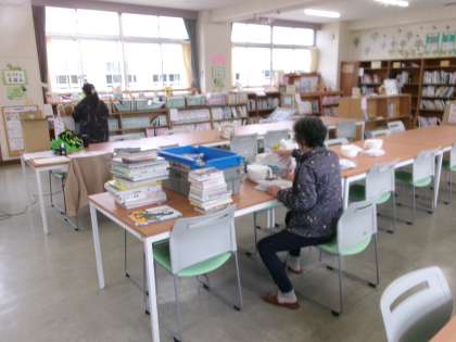 図書室の蔵書点検を行っています。学校図書館司書と図書ボランティアさんが図書館の本の数を確認してくださっています。