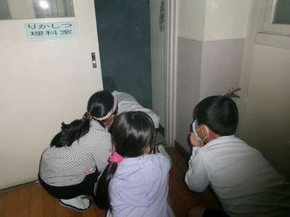 3年生は、煙道訓練を行いました。火災で煙が充満したとき、どうやって逃げたらよいかを学びました。真っ白な煙で回りがよく見えない中、ハンカチ等で口をおさえ、姿勢を低くして進みました。(煙は、人体に無害なものを使用しています。)