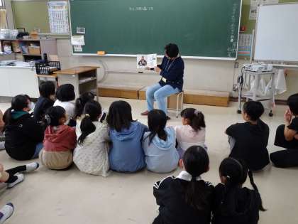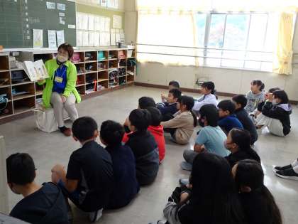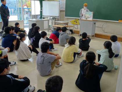 【お話の森 高学年】11/15 公開日 2024/11/18 更新日 2024/11/18 地域学校共働本部 高学年対象の読み聞かせがありました。6年生の教室では、里山学習に合わせて地域の昔話の描かれた手作りの紙芝居を読んでくださいました。