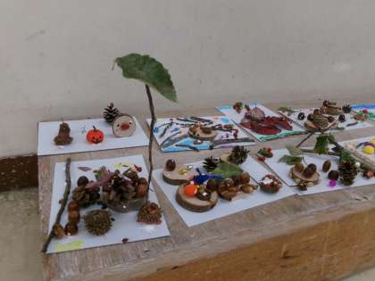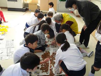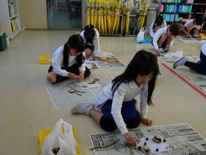【1・2年生 どんぐりで作品作り】11/19 公開日 2024/11/25 更新日 2024/11/25 各学年から 1・2年生は拾い集めたどんぐりや葉、木の実を使って作品作りをしました。講師に宮前の森クラブの方に来ていただき、作り方を教えてもらいました。