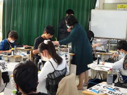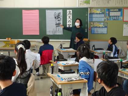 【3・6年生 書き初め指導】11/19 公開日 2024/11/25 更新日 2024/11/25 各学年から 3・6年生は、書道の先生のボランティアで、書き初めの指導をしていただきました。筆遣いや文字の配置などのこつを教えていただきました。