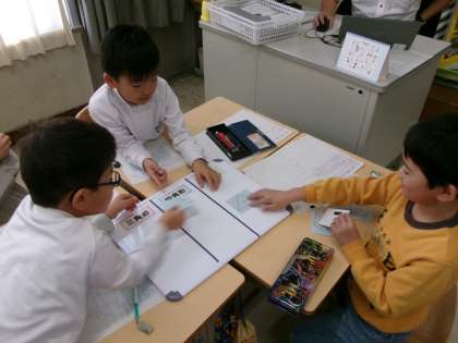 2年2組で算数の研究授業を行いました。三角形と四角形について学習しました。子どもたちは、それぞれの形を見て、三角形といえる理由、四角形といえる理由などをグループで話し合って、発表しました。