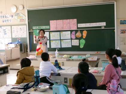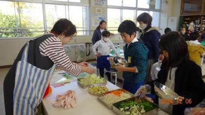 【4年生 食育の授業】12/5 公開日 2024/12/09 更新日 2024/12/09 各学年から 4年生は、養護教諭による食育「一日にとりたい野菜の量を知ろう」の授業が行いました。野菜が体にいいのはなぜかについてグループで考えて発表しました。その後、実際にどれくらいの量を一日にとったらいいのかを本物の野菜を使って確かめました。一日に必要な野菜の量が300グラムと知って、驚いていました。学習の後、野菜炒めにして食べました。