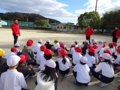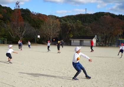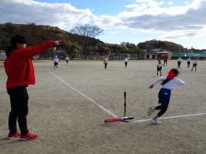 4年生は、投げ方教室を行いました。トヨタ自動車硬式野球部「レッドクルーザーズ」選手の方を講師に、ボールの投げ方を教えていただき、野球型のゲームを楽しみました。