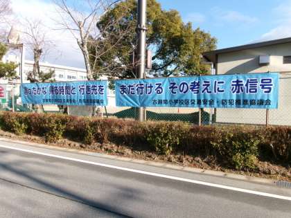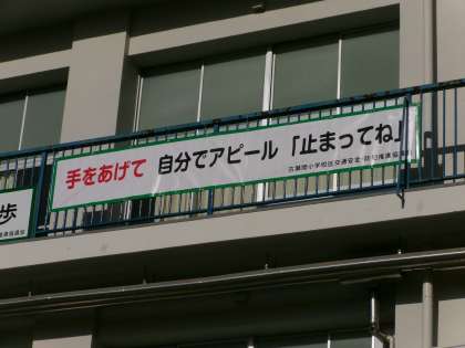 本年度募集した交通安全防犯標語コンクールの中で優秀作品を横断幕で掲示しました。交通安全標語「手をあげて 自分でアピール とまってね」は今後、下校時に子どもたちが唱和していきます。
