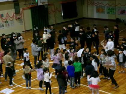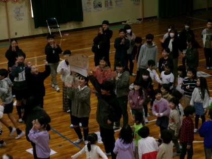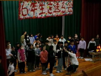【6年生を送る会(2)3・4年生出し物】3/4 公開日 2025/03/17 更新日 2025/03/17 学校行事 3・4年生は、事前に6年生にアンケートをとって6年間の思い出エピソードを聞き取り、大型かるたを作りました。3・4年生が読み、6年生と他の学年がカルタとりをしました。6年生が圧倒的に強くて、他の学年の児童も必死に札を探していました。