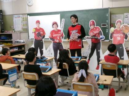2年生は本年度、投げ方教室でトヨタレッドテリアーズの選手のみなさんからボールの投げ方について指導を受けました。この日は、レッドテリアーズの広報の担当者の方が4月にあるイベントのお知らせにきました。子どもたちは、等身大のパネルをみて、レッドテリアーズの選手の方のことを思い出し、ボールの投げ方について教わったことも振り返っていました。ぜひレッドテリアーズの今後の活躍をみんなで応援したいと思います。