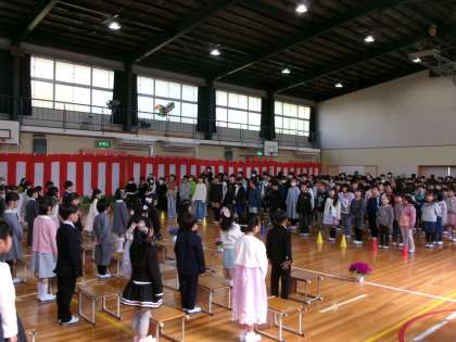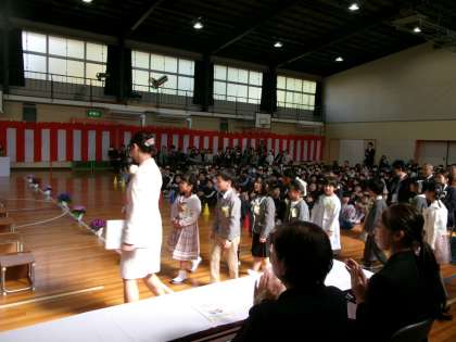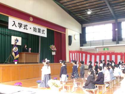 入学式、1年生はこれから古瀬間小学校での6年間が始まります。担任の先生に名前を呼ばれると一人一人「はい」と元気に返事。校長先生や来賓のお話もしっかり座って聞くことができました。2〜6年生の上級生に「お願いします」と声を合わせてごあいさつ。上級生はたくさんの拍手で歓迎の気持ちを表していました。