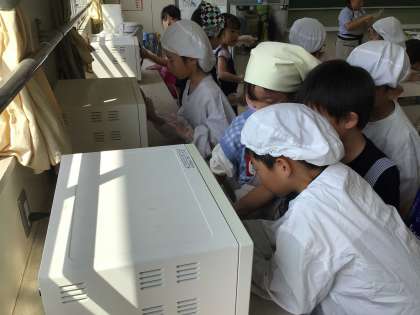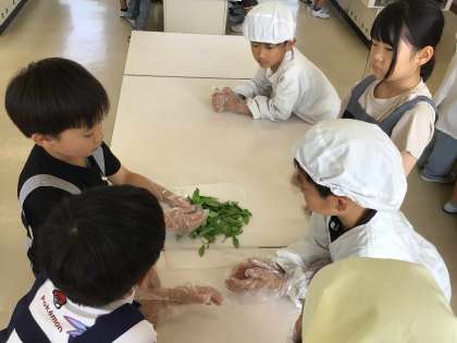 5月15日に茶摘みした茶葉でお茶を作りました。まず、摘み取った茶葉を蒸し、子どもたちで揉み、電子レンジで乾燥させました。出来上がった茶葉を急須に入れてみんなで飲みました。「少し苦いけど、おいしい」と新茶を味わいました。