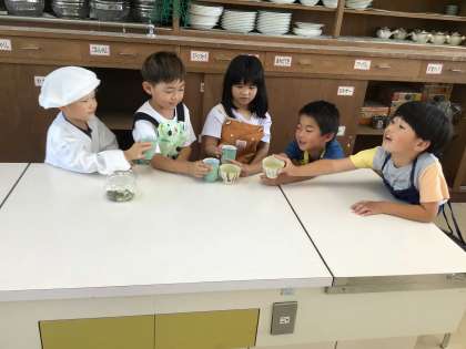 2年生のお茶会の続きです。湯呑に入れたお茶でみんなで「乾杯!」しました。