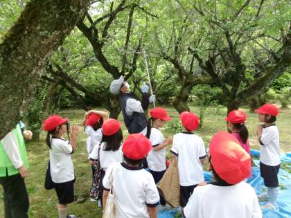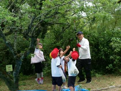 【梅採り 1年生】6/9 公開日 2025/06/13 更新日 2025/06/13 各学年から 1年生は、古瀬間城址に出かけ、梅採りを行いました。志賀町の保存会の方に梅の実を落としてもらい、たくさん採ることができました。