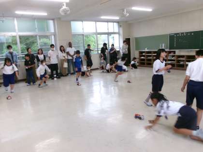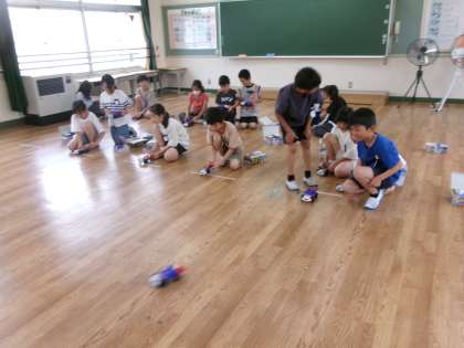 4年生の様子です。理科「電池の働き」の学習です。回路のつなぎ方や電流の流れについて学び、電池で動く車を作って走らせました。