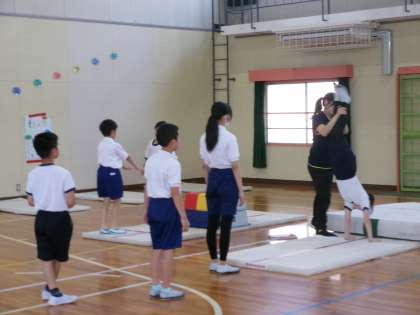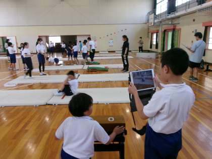 【5年2組 マット運動】6/30 公開日 2025/07/09 更新日 2025/07/09 各学年から 5年2組は、体育の研究授業でマット運動を行いました。自分のできることに合わせて演技構成を考えました。より美しい演技になるように、仲間とアドバイスをし合いました。学習用タブレットを使って演技の動画をとって、振り返りに使いました。多くの先生が見守る中、子どもたちは生き生きとマット運動に取り組んでいました。