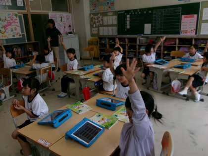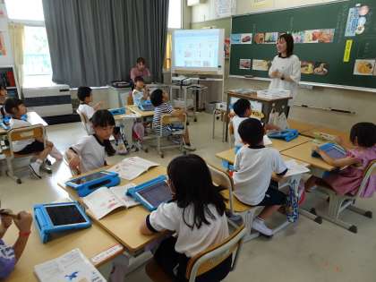 1年1組は国語の時間に教科書にある「たべもの」の詩を読み、自分たちのオリジナルの言葉遊び歌作りに取り組みました。学習用タブレットのスカイメニューに文字や写真を入力し、「がたんごとん でんしゃ」「ねばねば なっとう」など、工夫して楽しい言葉遊び歌を作っていました。