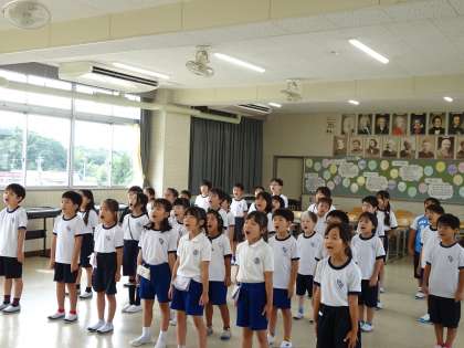 ひまわりネットワーク「ボクらの学び舎」の撮影。計画委員会のあいさつ活動から撮影をスタートしました。1年生は、「古瀬間小学校」のタイトルコール、2年生は校歌。元気いっぱい声を合わせました。