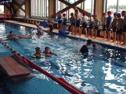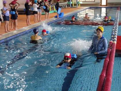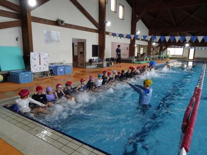 【3年 水泳指導】9/25 公開日 2025/09/25 更新日 2025/09/25 各学年から 本年度最初の水泳指導。昨年度と同様、豊田スイミングスクール美里校で行います。担任とコーチの指導の下、3年生は水慣れ・バタ足練習からスタートしました。子どもたちは腰にヘルパーを付け、ビート板を使い、安心して練習することができるようにしました。バスで学校に戻った子どもたちは、みんなにこにこ笑顔。初日の練習を楽しく終えることができました。