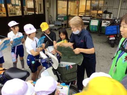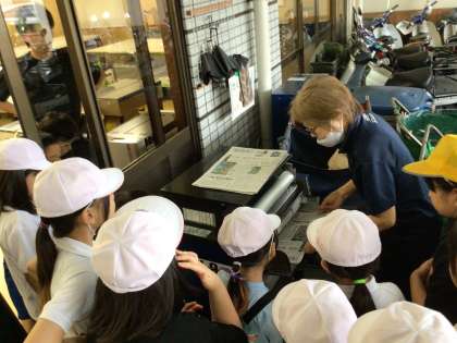 3年生は社会の学習で新聞販売店の見学に行きました。新聞販売店の方の話を聞いたり、配達するバイクを見せていただいたりしました。