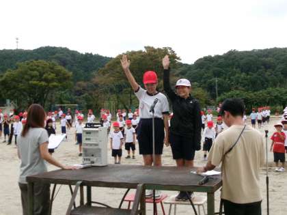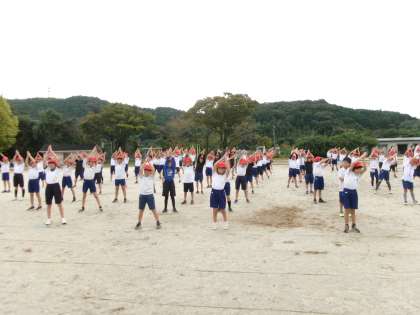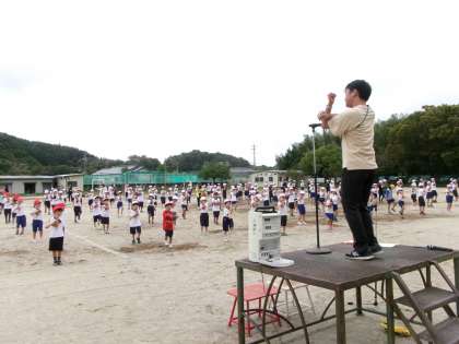 運動会開会式の全校練習を行いました。応援団長による選手宣誓、準備体操で行うKOSEMA体操などの練習をしました。