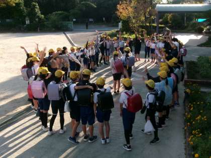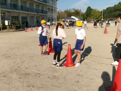 1〜5年生が下校した後、6年生が運動会の準備をしました。いよいよ運動会です。下校時に、6年生みんなで円になって運動会の成功をちかいました。