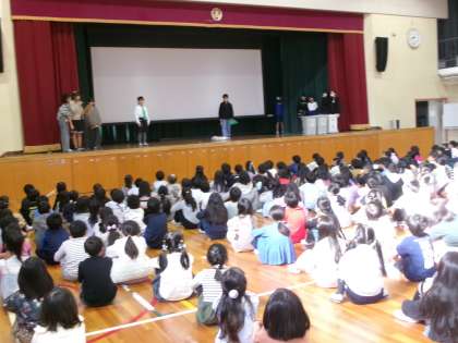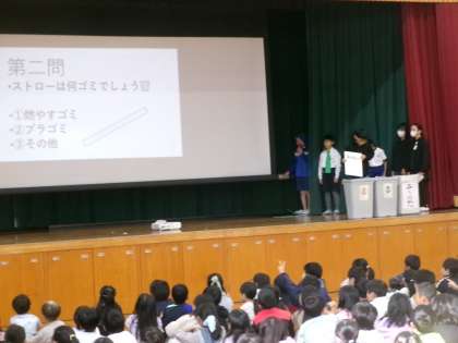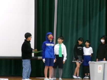 【児童集会 環境委員会「ごみの分別について」】11/6 公開日 2025/11/07 更新日 2025/11/07 特別活動 環境委員会がごみの分別についての集会を行いました。劇やクイズを入れて分かりやすく伝えました。